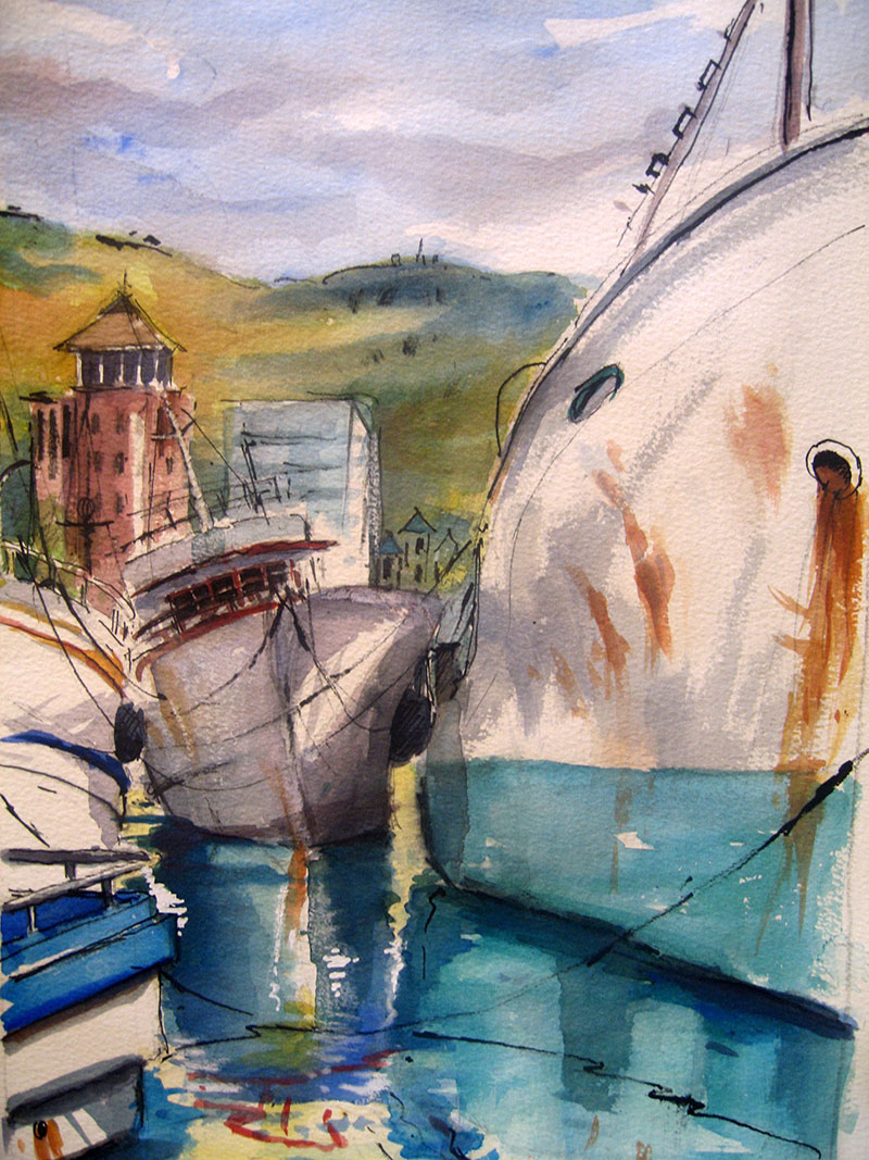 NO 18. Bateaux de peche a Trou Fanfaron. Dim 51 x 36 cm. Aquarelle sur papier Saunders Waterford.