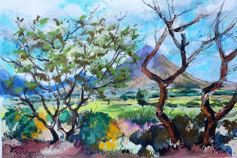 NO 4. La Tourelle de Tamarin vu de Casela. Dim 43 x 60 cm. Aquarelle sur papier Saunders Waterford